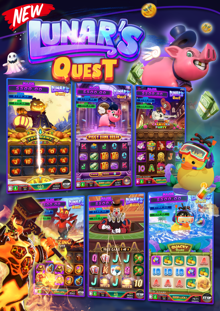 Step into the captivating world of the Lunar’s Quest Vertical Game! This state-of-the-art gaming experience brings together a collection of six exhilarating titles: Jack’s Lantern, Blazing Devil, Calavera Party, Clowning Around, Quacky Ducky, and Piggy Bank Break. With vibrant HD graphics and an intuitive touchscreen interface, the Lunar’s Quest promises endless hours of entertainment.